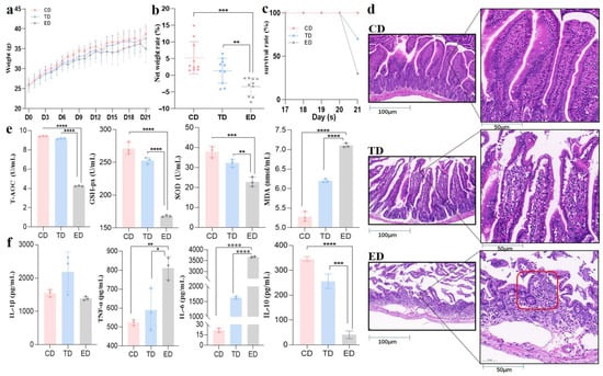Jejunum tissues (0.5–1 cm/animal) from mice in CD, TD, and ED were collected and fixed in a 4% formaldehyde solution for 48 h. The fixed samples were then sent to Wuhan Pinuofei Biological Technology (China) for hematoxylin and eosin (H&E) staining. Pathological analysis of villus integrity and damage was conducted using an Olympus CX33 microscope (Olympus, Hachioji, Tokyo, Japan), as described in a previous study [].