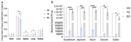 Variances among different mice groups (CD, TD, and ED) were analyzed using ANOVA and Student’s t-test via IBM SPSS (25.0). One-way ANOVA with Tukey’s post hoc test was used for comparisons across all three groups (e.g., body weight changes, organ indices, bacterial loads across intestinal segments, antioxidant markers, inflammatory cytokines, alpha diversity indices, and taxonomic and functional pathway abundances), while Student’s t-test was applied for pairwise group comparisons (e.g., weight loss in ED vs. CD/TD, bacterial load reduction in TD vs. ED, recovery of antioxidant markers in TD vs. ED). Results are presented as means ± standard error of the mean (SEM), with statistical significance set at p < 0.05.