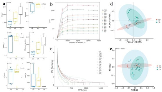 Alpha diversity analysis was employed to compare the microbial diversity within each group (Figure 4a). The Good’s coverage index ranged from 99.43 to 99.96% across the three groups, indicating that the sequencing results could reflect the entire bacterial structure. The α-diversity correlation index, a measure of species richness, was highest in the TD (1139.61 ± 406.73), followed by the ED (814.89 ± 367.2), and lowest in the CD (611.41 ± 679.61).
