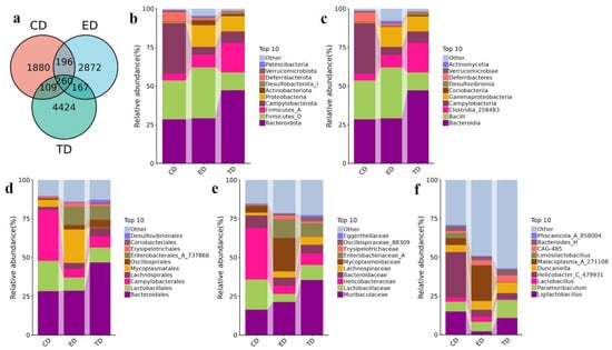 At the genus level, Ligilactobacillus was most abundant in the CD and TD (CD: 15.05%, TD: 10.86%) but scarce in the ED (2.18%). Helicobacter_C_479931 (29.34%) and Paramuribaculum (6.29%) were predominant in the CD, while Paramuribaculum (11.59%) and Helicobacter_D (8.74%) were more common in the TD. Malacoplasma_A_271108 (22.97%) was the most abundant genus in the ED. Additionally, 260 ASVs were shared across all three groups (Figure 5a). Figure 5b–f shows the top ten phyla, classes, orders, families, and genera among all three groups.