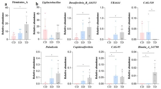 Then, the re-analysis demonstrated significant differences (p < 0.05) in both phylum and genus composition. Firmicutes A was notably higher in the TD (Figure 6a), while Ligilactobacillus was more abundant in the CD and TD. The TD also showed increased levels of Desulfovibrio R 446353, UBA644, Paludicola, Cupidesulfovibrio, and Blautia_A_141780, while CAG-95 and CAG-510 were more abundant in the ED (Figure 6b).