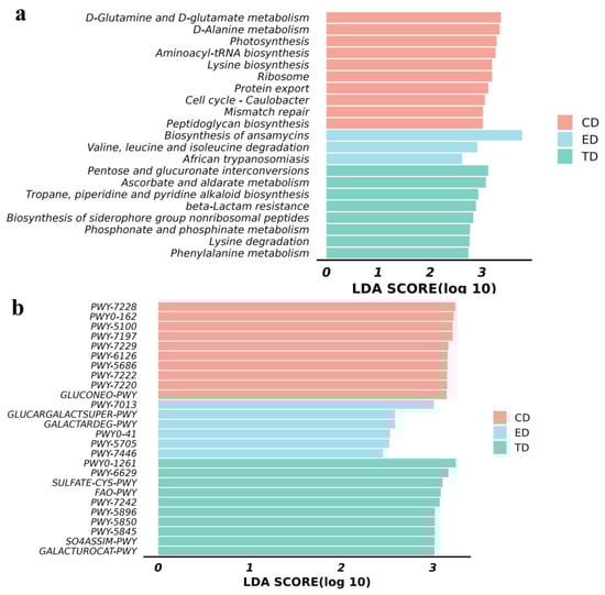 Differential metabolic pathways were analyzed using the KEGG and MetaCyc databases. The KEGG results revealed several pathways with LDA scores greater than 2 in the CD, including aminoacyl-tRNA biosynthesis, D-glutamine and D-glutamate metabolism, D-alanine metabolism, photosynthesis, lysine biosynthesis, ribosome production, protein export, mismatch repair, and peptidoglycan biosynthesis. In contrast, the ED showed higher LDA scores in pathways such as the biosynthesis of ansamycins, African trypanosomiasis, and the degradation of valine, leucine, and isoleucine.