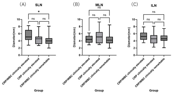 Lymph node diameters in dogs with clinically elevated CRP and WBC, clinically elevated CRP and normal WBC, and clinically unremarkable CRP and WBC. (A) sternal lymph nodes; (B) cranial mediastinal lymph nodes; (C) internal iliac lymph nodes. *: significant different, ns: not significant.