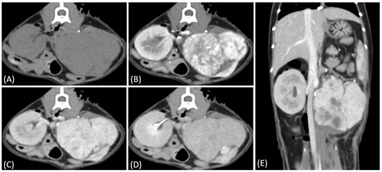 (A) Pre-contrast, (B) corticomedullary phase, (C) nephrographic phase, and (D,E) late nephrographic/early excretory phase contrast-enhanced computed tomography (CT) images of a cat with a unilateral left renal cell carcinoma. The tumor demonstrates predominantly heterogeneous and plateau enhancement patterns throughout the phases, with focal areas of intense enhancement visible during the corticomedullary phase.
