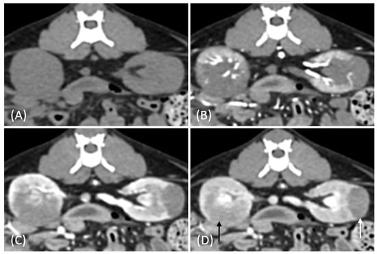 (A) Pre-contrast, (B) corticomedullary phase, (C) nephrographic phase, and (D) delayed nephrographic/early excretory phase contrast-enhanced computed tomography (CT) images of a cat with bilateral renal and small intestinal lymphoma. The right kidney shows an infiltrative mass (black arrow), while the left kidney has an expansile mass (white arrow). Both tumors are homogeneous and hypodense, demonstrating progressive enhancement.