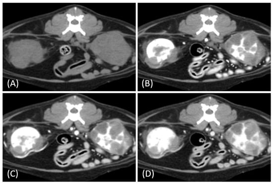 (A) Pre-contrast, (B) corticomedullary phase, (C) nephrographic phase, and (D) delayed nephrographic/early excretory phase contrast-enhanced computed tomography (CT) images of a cat with primary renal lymphoma. The right kidney shows a unilateral, infiltrative mass with noticeable hypertrophy. The tumor is homogeneous and hypodense, displaying progressive enhancement.