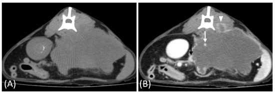 - Tanaka, T.; Akiyoshi, H.; Nishida, H.; Mie, K.; Lin, L.S.; Iimori, Y.; Okamoto, M. Contrast-Enhanced Computed Tomography Findings of Canine Primary Renal Tumors Including Renal Cell Carcinoma, Lymphoma, and Hemangiosarcoma. PLoS ONE 2019, 14, e0225211. [Google Scholar] [CrossRef]