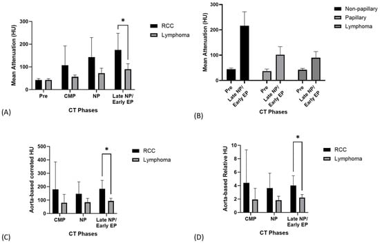 Computed tomography (CT) attenuation values of renal cell carcinoma (RCC) and lymphoma across different phases: (A) Mean attenuation values (Hounsfield Units, HU) of RCC and lymphoma. A significant difference was observed in the delayed nephrographic/early excretory phase (p < 0.05). (B) Mean attenuation values of RCC subtypes (non-papillary, papillary) and lymphoma in the pre- and delayed nephrographic/early excretory phases. (C) Aorta-based corrected HU values for RCC and lymphoma, with a significant difference in the delayed nephrographic/early excretory phase (p < 0.05). (D) Aorta-based relative HU values for RCC and lymphoma. A significant difference was noted in the delayed nephrographic/early excretory phase (p < 0.05). HU = Hounsfield Unit; RCC = renal cell carcinoma; CT, computed tomography; CMP = corticomedullary phase; NP = nephrographic phase; EP = excretory phase. * statistically significant result.