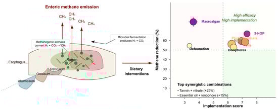 Climate change mitigation remains among the most pressing challenges confronting contemporary society, with greenhouse gas emissions continuing to alter the Earth’s climate system at an unprecedented rate. Within this context, the agricultural sector contributes approximately 14.5% of global emissions, with enteric fermentation in ruminant livestock constituting a significant component of this footprint [1]. Specifically, enteric methane accounts for 30–38% of all agricultural methane emissions and represents a particularly promising target for mitigation efforts due to methane’s substantial global warming potential, which is 27–30 times greater than carbon dioxide over a 100-year timeframe, and relatively short atmospheric lifetime of 8–12 years [2].