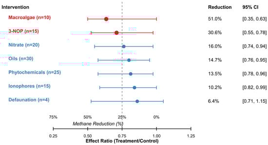 Forest plot of the comparative efficacy of dietary interventions for enteric methane mitigation. An effect ratio < 1 indicates methane reduction; values represent the proportion of methane remaining relative to the control. Error bars represent 95% confidence intervals.