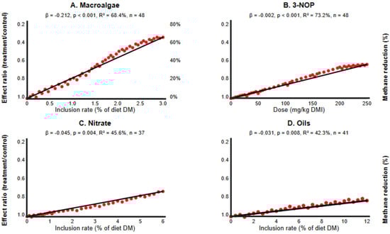 Dose–response relationships for selected interventions: (A) Macroalgae (β = −0.212, p < 0.001, R2 = 68.4%); (B) 3-NOP (β = −0.002, p < 0.001, R2 = 73.2%); (C) Nitrate (β = −0.045, p < 0.01, R2 = 45.6%); (D) Oils (β = −0.031, p < 0.01, R2 = 42.3%).