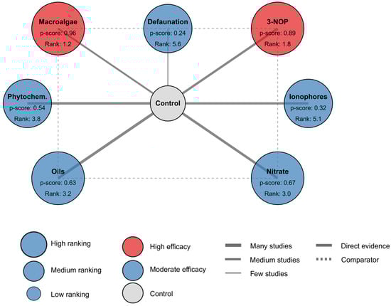 Consistent with the conventional meta-analysis results, macroalgae demonstrated superior efficacy in the network analysis, with a network effect ratio of 0.46 [95% CI: 0.35, 0.61], corresponding to a 54% methane reduction. This intervention achieved the highest probability of being the best treatment (P-score = 0.96) and the lowest mean rank (1.2), with a 63% probability of ranking first among all interventions. These metrics collectively provided robust evidence for the superiority of macroalgae compared to other interventions.
