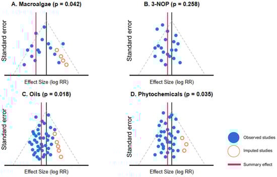 The assessment of publication bias revealed significant asymmetry in the distribution of effect sizes for macroalgae (Egger’s test p = 0.036) and phytochemicals (p = 0.042), suggesting potential publication bias favoring positive results (Table 6). Visual examination of funnel plots confirmed this asymmetry (Figure 5). For macroalgae, the trim-and-fill analysis imputed three hypothetical “missing” studies, resulting in an adjusted effect ratio of 0.56 [95% CI: 0.42, 0.74], which translated to a methane reduction of 44.0% compared to the original estimate of 51.0%. This represented a 14.3% attenuation in the apparent efficacy of macroalgae after accounting for potential publication bias.