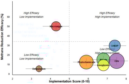 This meta-analysis establishes a comprehensive, empirically grounded framework for evaluating dietary interventions for enteric methane mitigation that integrates efficacy metrics with implementation factors. Our findings conclusively demonstrate the superior efficacy of macroalgae (51.0% reduction) and 3-NOP (30.6% reduction) compared to conventional interventions, with significant dose–response relationships providing quantitative parameters for optimizing application protocols. The identification of mechanistically predictable synergistic interactions and systematic animal-specific effects offers pathways toward enhanced mitigation outcomes through targeted intervention strategies. The integration of efficacy and implementation metrics revealed 3-NOP as occupying an optimal position combining strong efficacy with favorable implementation characteristics, while macroalgae faces substantial implementation barriers despite superior efficacy. These findings support a differentiated approach to mitigation strategy development: near-term deployment focusing on interventions with balanced efficacy and implementation profiles, concurrent with strategic research investments in high-efficacy but currently challenging interventions and systematic exploration of synergistic combination approaches. By systematically addressing the complex interplay between intervention efficacy, dose–response relationships, animal-specific effects, implementation barriers, and combination potential, this analysis establishes a foundation for more targeted and effective approaches to reducing enteric methane emissions from ruminant production systems.