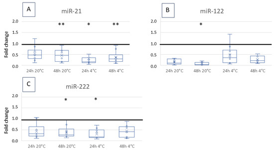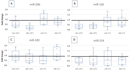 | Kupec et al., 2022 | miR-22, 23, 27b, 28, 99a, 100, 125b, 151a, 192, 193a, 193b, 194, 323b, 361, 1260a | human | serum | 14 days at −80 °C | Slightly lower expression after storage. Differences between miRNAs. | [18] |