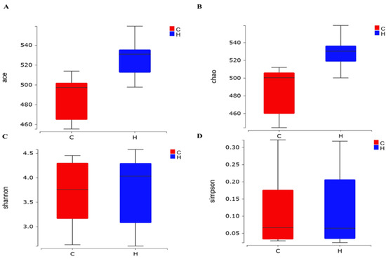 The α-diversity analysis of two groups of samples can accurately reflect the species and structural diversity of the microbial community in the rumen. The rumen microbial Chao and ace indices of the H group significantly differ from those of the C group (p < 0.05), indicating that the addition of phytogenic feed additive had a marked effect on the relative abundance of the intestinal microbial flora of the broilers (Figure 1A–D).