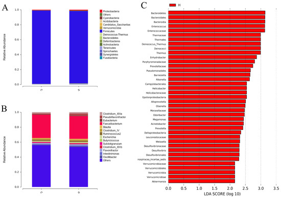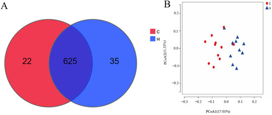 As illustrated in Figure 2A, the total number of operational taxonomic units (OTUs) in group C was 647, and the total number of OTUs in the H group was 660. Principal coordinates analysis demonstrated that the flora between the H and C groups were distinctly separated but showed a notable degree of similarity (Figure 2). The results show that the phytogenic feed additive exerted a considerable influence on the regulation of the intestinal flora of the broilers.