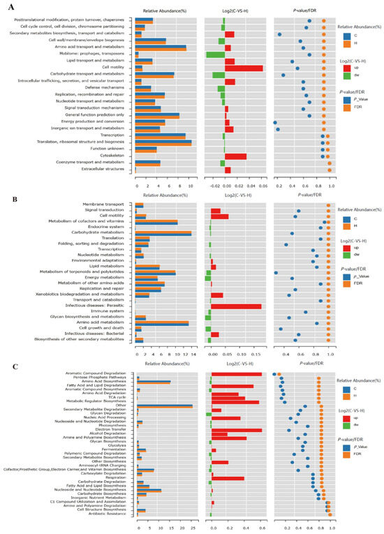 Prediction of the effects of phytogenic feed additive on COG, KEGG, and Metacyc pathways. (A) COG access road forecast, (B) KEGG access road forecast, and (C) Metacyc access road forecast.