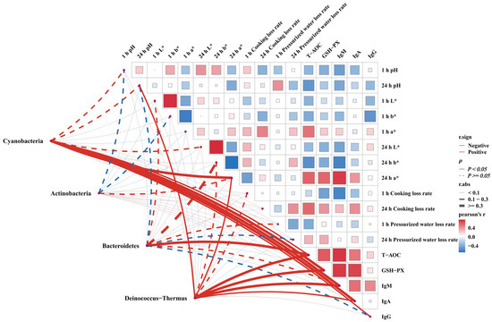The Spearman’s correlation analysis results of the antioxidant-, immune- [16], and meat-quality-related indicators with gut differential phyla showed that the two differential phyla, Cyanobacteria and Deinococcus-Thermus, were strongly correlated with the immune indicators of IgA and IgM, respectively (r > 0.5, p < 0.05), suggesting that the relative abundance of these two phyla changes indirectly regulated the immunity level of white-feathered broilers. The results further indicated that the additive may not only directly regulate the gut flora of white-feathered broilers, but also indirectly regulate the immunity of white-feathered broilers through the relative abundance of the gut flora of white-feathered broilers (Figure 5).
