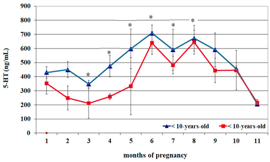 Circulating serotonin (5-HT) concentrations (Mean ± S.D.) in lactating pregnant Spanish Purebred mares aged < 10- and >10 years old throughout the entire pregnancy. Asterisk indicates significant differences versus >10-year-old mares (p < 0.05).