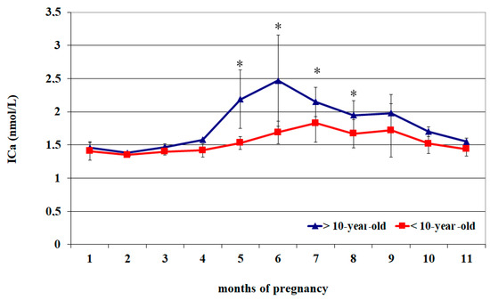 Compared to >10-year-old mares, those aged < 10 years old showed greater ICa2+ concentrations from the 5th to the 8th month of pregnancy (p < 0.05) (Figure 2).