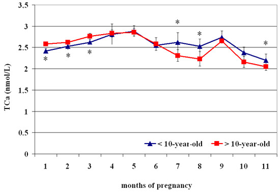 The circulating TCa2+ concentrations showed superimposed profiles both in <10- and >10 year olds (Figure 3), with lower values at the 1st–2nd month than the 3rd–5th month (p < 0.05) and greater at the 4th–5th month than the 6th–11th month (p < 0.05); greater values were recorded at the 9th month than the 10th–11th month (p < 0.05) (Table 3). Compared to >10 year olds, those aged < 10 showed lower TCa2+ concentrations from the 1st to the 3rd month and greater values at the 7th, 8th, and 11th month of pregnancy (p < 0.05) (Figure 3).