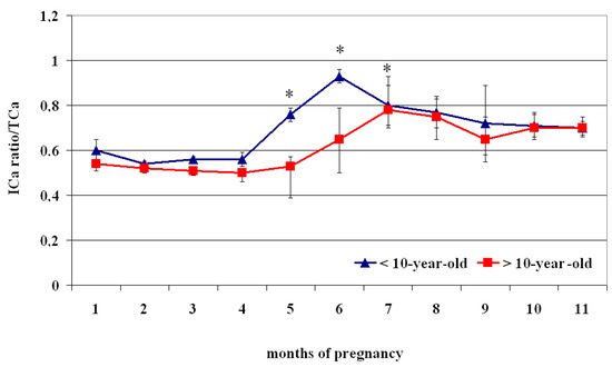 Compared to > 10-year-old mares, those aged < 10 showed a significantly greater ratio of ICa2+/TCa2+Ca from the 5th to the 7th month of pregnancy (p < 0.05) (Figure 4).