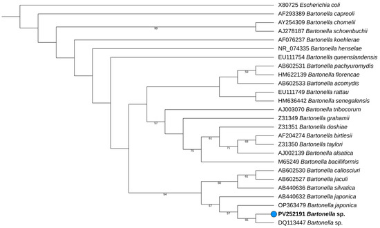BLAST analysis of the consensus sequence of the 16S rRNA gene from the sample 44SK showed a homology of 98.89% with the isolate Bartonella sp. AD273, (accession number DQ113447), previously identified in a mite (Steatonyssus sp.) taken from a Tanzanian bat (Taphozous perforatus) [22]. To further investigate the phylogenetic relationship of the detected Bartonella sp., a phylogenetic tree was constructed based on the 16S SSU rRNA gene sequences. The tree included reference sequences from closely related Bartonella species, as well as E. coli as a suited outgroup, to improve phylogenetic placement and provide insights into the evolutionary position of the present isolate. As shown in Figure 1, sample 44SK (PV252191) is placed within the Bartonella japonica cluster and is closely related to Bartonella sp. (DQ113447), reinforcing its similarity with this previously identified strain.