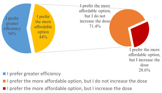 Specifically, 45 responses were negative (56%), while 35 veterinarians (44%) stated that they would choose a more affordable option. Among the 35 who indicated that they would choose a more affordable option, only 10 (28.6%) said that they would increase the dose, considering the reduced efficacy of the antimicrobial, while the remaining 25 (71.4%) confirmed that they would stick to the usual recommended doses (Figure 1).