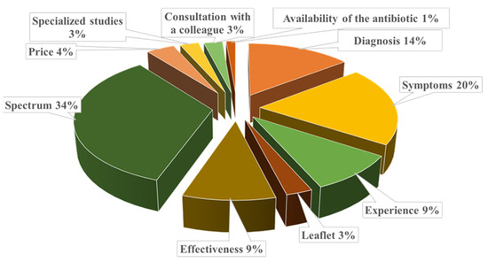 The main criteria for choosing a specific antimicrobial were assessed through an open-ended question, allowing veterinarians to freely indicate the factors influencing their decision-making process. Among the surveyed veterinarians were the spectrum of action, animal symptoms, and diagnosis (Figure 2). Regarding the spectrum of action, of the 26 respondents who specified this criterion, 17 (65.3%) mentioned that they prefer a broad-spectrum antimicrobial.