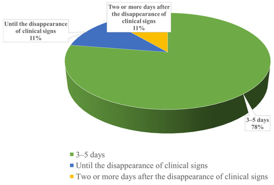 Among the interviewed veterinarians, the majority (n = 62, 78%) reported administering antimicrobials for a standard duration of 3–5 days, regardless of the disappearance of clinical signs. A smaller number of veterinarians (n = 9, 11%) indicated that they continue therapy until the clinical signs disappear, and an equal number (n = 9, 11%) reported maintaining therapy for an additional two days after the disappearance of clinical signs (Figure 3).
