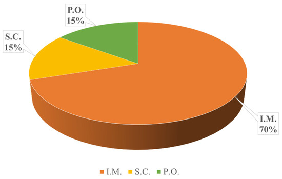 Another important aspect of this questionnaire was determining the most frequently used route of antimicrobial administration. Among the 80 surveyed veterinarians, the majority (n = 56, 70%) prefer intramuscular administration, followed by oral administration (n = 12, 15%) and subcutaneous administration (n = 12, 15%) (Figure 4).