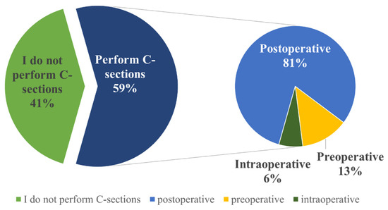Out of the 80 respondents, 33 (41%) do not perform C-sections. Among those who do perform this procedure (n = 47, 59%), the majority choose to administer antimicrobials postoperatively (n = 38, 81%), while a small percentage administer them preoperatively (n = 6, 13%) or intraoperatively (n = 3, 6%) (Figure 5). The most commonly administered antimicrobials are combinations of beta-lactam and aminoglycoside antimicrobials (procaine benzyl penicillin + dihydrostreptomycin sulfate) (Table 2).