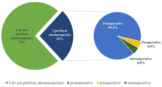 Regarding abomasopexy procedures, 59 (74%) veterinarians responded that they do not perform this surgical operation, while the remaining 21 (26%) veterinarians do perform it (Figure 6). Among these 21 veterinarians, the majority (n = 19, 90.4%) stated that they administer antimicrobials postoperatively, with only a small percentage administering antimicrobials preoperatively (n = 1, 4.8%) or intraoperatively (n = 1, 4.8%) (Figure 6).