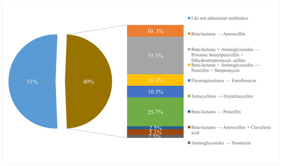 Additionally, it was intended to determine whether veterinarians administer antimicrobials when castrating piglet and, if so, which ones they use. Among the total respondents, 41 (51%) veterinarians stated that they do not administer any antimicrobials, while 39 (49%) responded that they do administer antimicrobials, mentioning that the most frequently used combinations are from the beta-lactam and aminoglycoside classes, specifically procaine benzylpenicillin + dihydrostreptomycin sulfate (n = 13, 33.3%) and penicillin + streptomycin (n = 4, 10.3%), specifying the commercial product known as Pen-Strep and the class of tetracyclines (n = 10, 25.7%) (Figure 7).