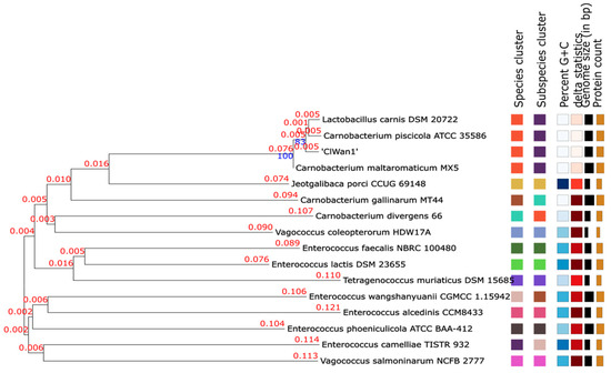 Phylogeny utilizing the 16S rRNA gene was used to initially classify isolate ClWan1 as a unique Carnobacterium maltaromaticum. Also, phylogenetics of the 16S rRNA gene using Species Finder [46] resulted in ClWan1 being most closely related to C. maltaromaticum strain S_T_MRS_58 [JX860544]. Subsequently, the WGS was used to confirm this result (Figure 2 and Supplementary Figures S2 and S3). This analysis resulted in ClWan1 being closely related to C. maltaromaticum and C. piscicola. Interestingly, a bacterium originally classified as Lactobacillus carnis strain DSM20722 isolated from vacuum-packaged meat appears to be a Carnobacterium sp. by the TYGS-LPSN analysis [61]. This bacterium was reclassified as a C. maltaromaticum [62], while C. maltaromaticum MX5, originally isolated from milk as Lactobacillus maltaromicus [63], was also reclassified as C. maltaromaticum [62]. These isolates are closely related to ClWan1 isolated from a Gray wolf gastrointestinal tract. The C. maltaromaticum MX5 is considered a type strain (also ATCC® 27865™) for the species [JQMX00000000] and is the nearest neighbor for ClWan1 (Figure 2).