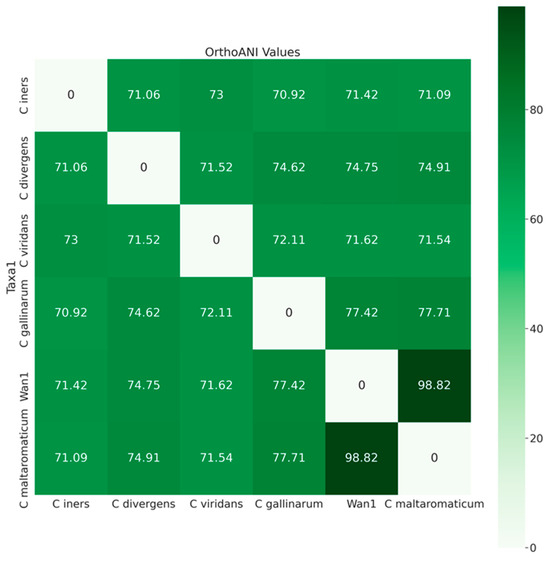 Further analysis utilizing average nucleotide identities (orthoANI) classified isolate ClWan1 as a C. maltaromaticum (Figure 3). The ANI of ClWan1 was 98.82% similar to C. maltaromaticum and only 77.71% similar to its nearest neighbor species, a C. gallinarum isolate.