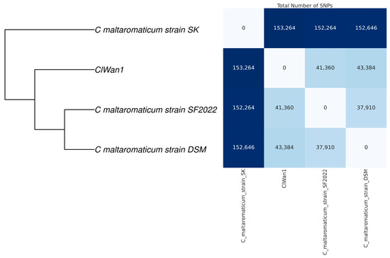 Using single nucleotide polymorphism (SNP) analysis of the core genome, it was determined that ClWan1 was a unique ST among C. maltaromaticum isolates (Figure 4). The core genome SNP analysis demonstrated that ClWan1 had 41,360 SNPs from its nearest neighbor C. maltaromaticum strain SF2022.