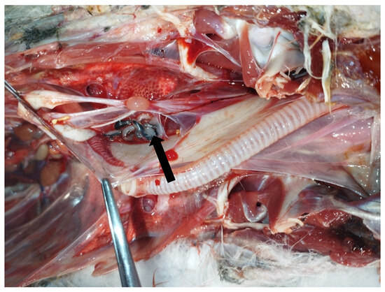 Necropsy of a deceased yellow-legged gull (Larus michahellis) showing the presence of pentastomes (arrow) in the interclavicular air sac.