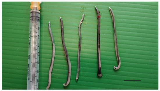 Parasites collected from the interclavicular air sac of a deceased yellow-legged gull. Scale bar 1 cm.