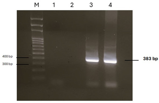 The 383 bp band of each extracted sample was excised and purified using the QIAquick gel extraction kit (Qiagen) and the obtained products were sequenced by a commercial laboratory (BMR-Genomics, Padova, Italy). The sequences were assembled and corrected by visual analysis of the electropherogram using Bioedit v.7.2, and then compared with those available in GenBank using the BLAST program 2.15.0 (http://www.ncbi.nlm.nih.gov/BLAST, accessed on 10 January 2024).