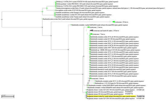 Dendrogram displaying genetic relationships of the PV450763 sequence analyzed in this study with other Reighardia sternae.