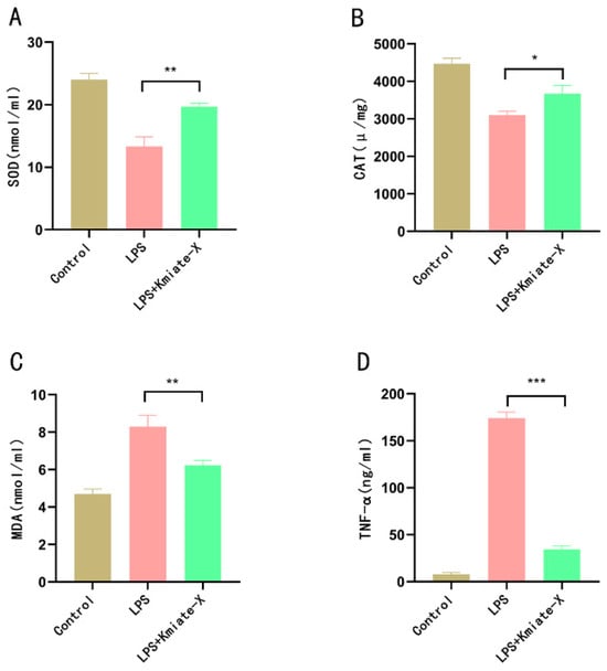 Effects of Enterococcus faecium Kimate-X on alleviating LPS-induced oxidative stress in RAW 264.7 cells. (A) superoxide dismutase (SOD), (B) catalase (CAT), (C) malondialdehyde (MDA), and (D) tumor necrosis factor-α (TNF-α) in the culture supernatants. Bars represent the mean ± SD of three independent experiments (n = 3). Statistical significance was determined by Tukey’s HSD test (* p < 0.05, ** p < 0.01, *** p < 0.001).