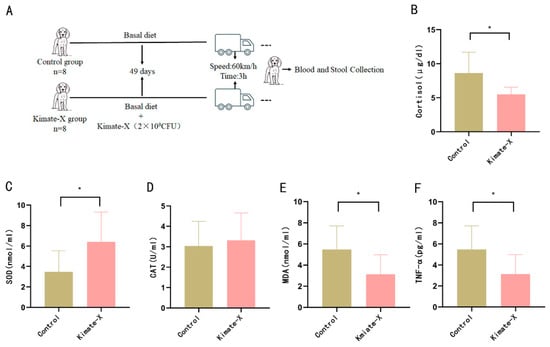 Effects of Enterococcus faecium Kimate-X on antioxidant and inflammatory markers in transport-stressed dogs. (A) Schematic overview of the experimental design. (B) Cortisol levels, (C) SOD activity, (D) CAT activity, (E) MDA content, and (F) TNF-α concentration are shown. Data are presented as mean ± SD (n = 8 per group). Asterisks indicate significant differences between the Control and Kimate-X groups (* p < 0.05), as determined by Student’s t-test.