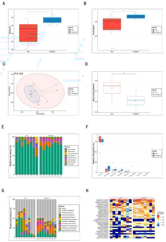 We analyzed the fecal microbiota composition of dogs in the Control and the Kimate-X treatment group using metagenomic data. The results showed that the Shannon index and Simpson index of the Kimate-X group were significantly higher than those of the Control (p < 0.05) (Figure 3A,B). The PCoA plot based on the Bray–Curtis distance matrix (Figure 3C) showed clear differences in the gut microbiota structure between the Control and the Kimate-X group, with the two groups distinctly separated on the PCoA plot, indicating that Kimate-X treatment significantly altered the gut microbiota community structure. Bray–Curtis distance analysis (Figure 3D) further confirmed this, as the Bray–Curtis distance of the Control was significantly higher than that of the Kimate-X group (p < 0.001), demonstrating that Kimate-X treatment significantly changed the gut microbiota composition. At the phylum level, the bacterial taxa composition was similar between the Control and the Kimate-X group, but the relative abundance of major phyla differed (Figure 3E). Box plots (Figure 3F) further confirmed these observations. At the species level (Figure 3G), the relative abundance of Prevotella copri clade A and Streptococcus lutetiensis was higher in the Kimate-X group, whereas the relative abundance of Lactobacillus johnsonii was higher in the Control. The heatmap of gut microbiota relative abundance at the species level (Figure 3H) showed that Prevotella copri clade A and Ligilactobacillus animalis were more abundant in the Control, while Streptococcus lutetiensis and Streptococcus alactolyticus were more abundant in the Kimate-X group, indicating that these species played an important role in the Kimate-X group. Additionally, the relative abundance of Prevotella copri clade A and Ligilactobacillus animalis was lower in the Kimate-X group. Detailed information on the microbiota is provided in Supplementary Table S1.