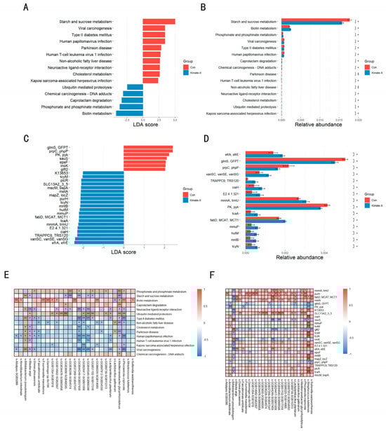 Composition, gene differences, and correlation analysis of fecal microbiota in dogs. Metagenomic data from the same fecal samples as in Figure 3 were used for functional annotation. (A,C) show LDA (linear discriminant analysis) scores from LEfSe indicating differentially abundant pathways or gene functions, whereas (B,D) display their relative abundances. (E) Heatmap of correlations between differential bacterial species and metabolic pathways; (F) heatmap of correlations between species and functional genes. A positive correlation is represented in red, and a negative correlation in blue, with deeper color intensity indicating a stronger correlation. Data were compared using the LEfSe method (Kruskal–Wallis + Wilcoxon test, followed by LDA). Differences were considered significant when the LDA score was greater than 2 and p < 0.05 (* indicates p < 0.05, and ** indicates p < 0.01).