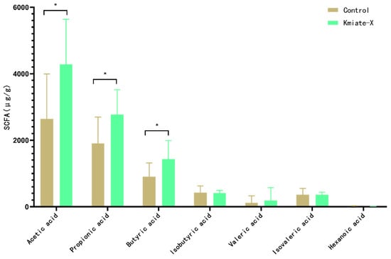 Figure 5 shows the differences in SCFA content between the Control and Kimate-X group. The study found that Kimate-X treatment significantly increased the levels of acetate compared to the Control (p < 0.05). Propionate levels were also significantly higher in the Kimate-X group than in the Control (p < 0.05). Additionally, as an important indicator of gut health, butyrate content was significantly increased in the Kimate-X group (p < 0.05). However, there were no significant differences in the contents of valerate, caproate, and heptanoate between the two groups.