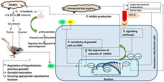 Graphical abstract showing the molecular regulation of inhibin and related hormones on the hypothalamus–pituitary–gonadal axis. As seasonal breeder birds (long and short days), the photoperiod has a direct effect on hormonal regulation and the HPG axis. Inhibin protein is produced by Sertoli cells (having subunits α and β). Elevated inhibin (INH) produces a negative feedback in relation to FSH and lowers its secretion.