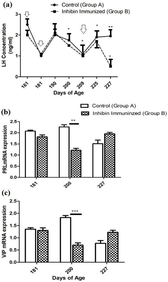 The quantitative real-time (qRT-PCR) analysis showed that the level of VIP mRNA expression in the hypothalamus was significantly (p < 0.001) decreased in the INH group, while significant (p < 0.001) increases were observed in the INH group at day 181 of age after the immunization treatment. However, the level of VIP mRNA expression in the hypothalamus was increased in the INH group, and a lower expression was observed in the CON group after the immunization treatment at the end of the experiment at day 227 of age (Figure 2b).