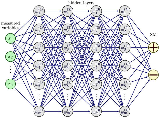 Fully connected artificial neural network scheme. The measured variables (x) stored in the databases used form the input layer, where the number (n) of nodes equals the number of the involved variables. The output layer (SM) contains nodes according to the target variable’s required class number. In our case, the subclinical mastitis state of a given animal can be positive or negative. Between the input and output layers, the nodes (m) of the hidden layers (upper index) store the parameters (weights: w) of the model. During the training, the weights are updated iteratively to reach the best classification of the output. The arrows represent the direction of information flow in training and prediction. From various architectures (with hidden layer and node numbers), based on the predictive performance, the best model is chosen by model selection.